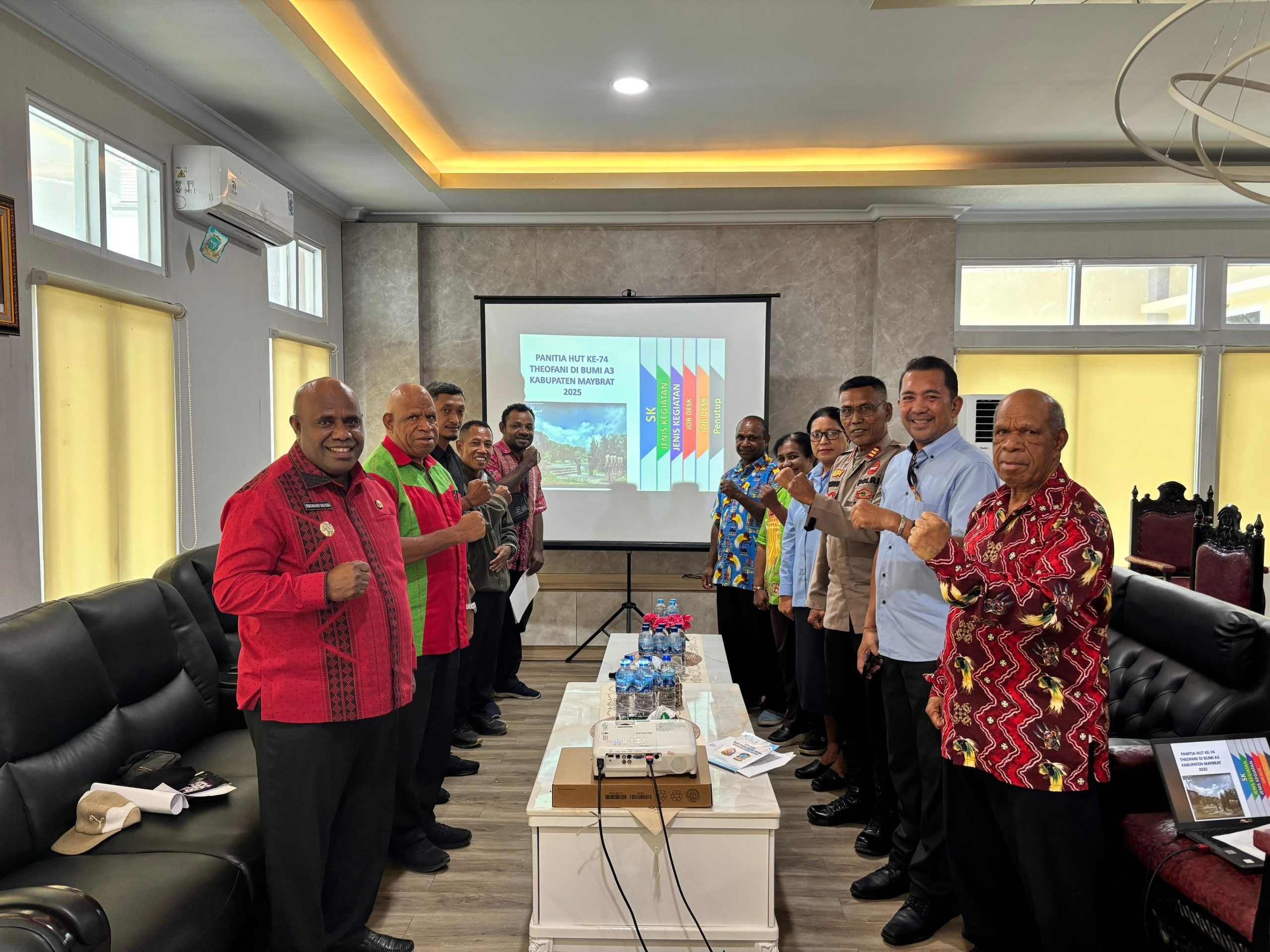 Rapat yang digelar pada Kamis, 25 September 2025 di Kantor Bupati Maybrat ini dipimpin langsung oleh Ketua Panitia HUT ke-74 Theofani, Wakil Bupati Maybrat Ferdinando Solossa, S.E. Turut hadir staf Pemda Maybrat, Wakil Ketua Panitia Agustinus Saa selaku tokoh masyarakat Kabupaten Maybrat, Pendeta Melvin F. Tuera, S.Th., serta perwakilan dari Kodim 1809/Maybrat.