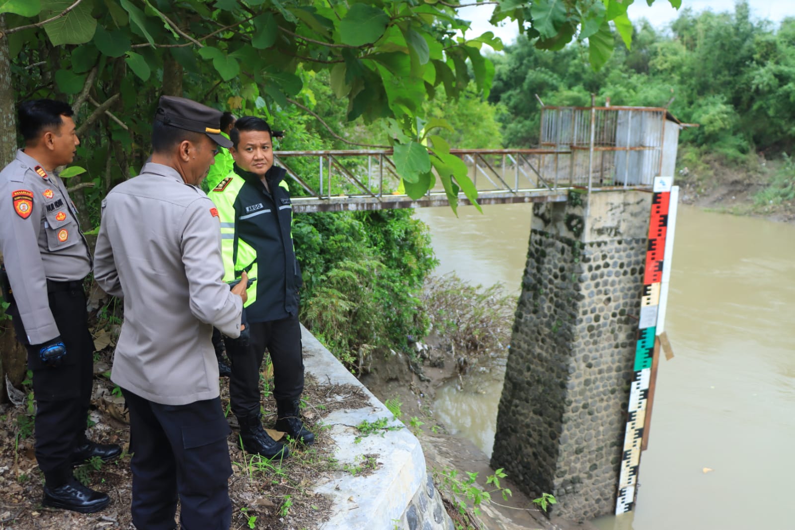 Rombongan berangkat bersama dari Polres Ngawi pukul 15.00 WIB dan menuju ke Dsn. Putat Ds. Kendung Kec. Kwadungan untuk melakukan pengecekan tanggul bronjong yang longsor dan jembatan di Desa Purwosari Kecamatan Kwadungan.
