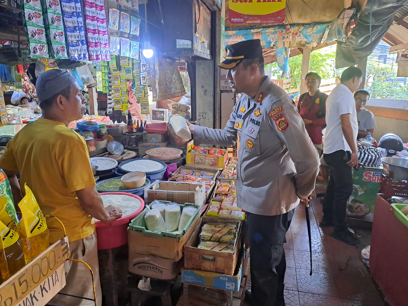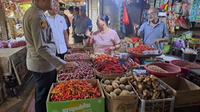 Bertempat di dalam Pasar Tradisional Tabanan berlangsung giat Pengecekan Pasar dalam rangka monitoring kesediaan harga pangan oleh Kapolres Tabanan AKBP Leo Dedy Defretes, S.H., S.I.K, M.H.