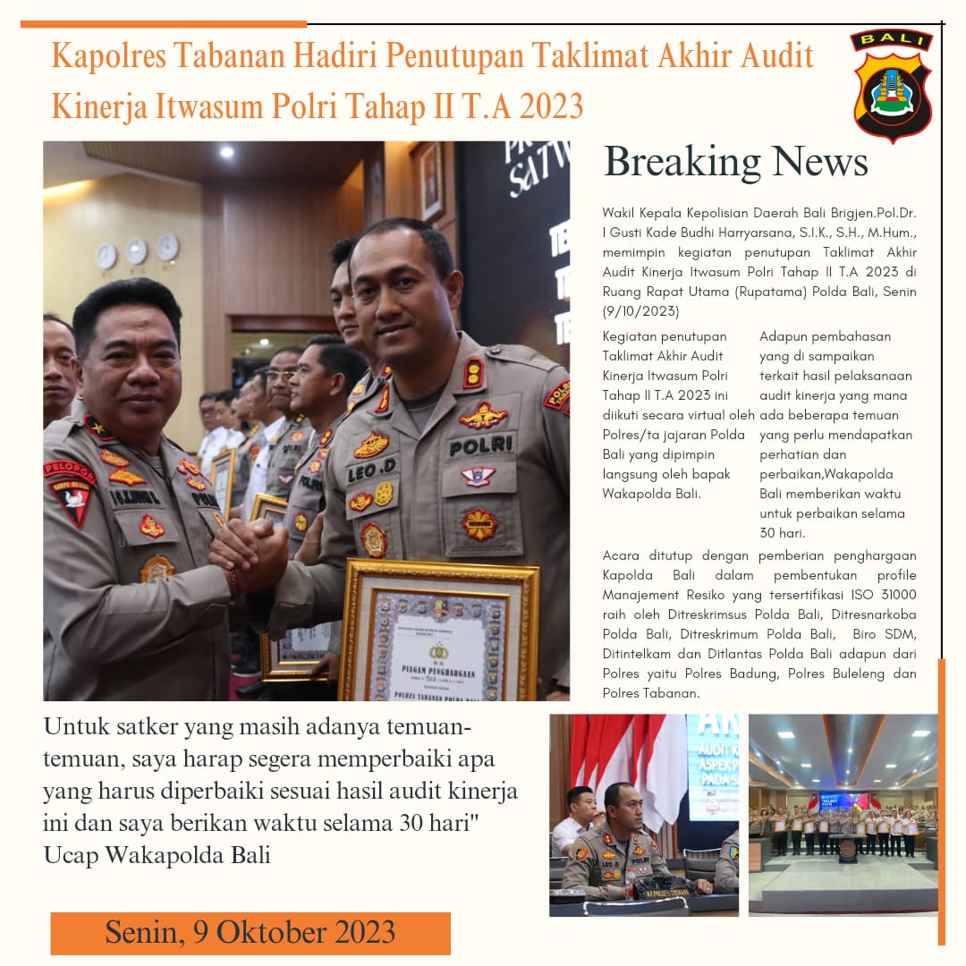 Kegiatan penutupan Taklimat Akhir Audit Kinerja Itwasum Polri Tahap II T.A 2023 ini diikuti secara virtual oleh Polres/ta jajaran Polda Bali yang dipimpin langsung oleh bapak Wakapolda Bali.