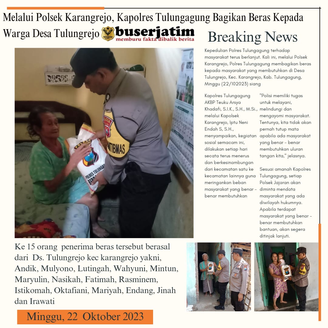 BUSERJATIM.COM || TULUNGAGUNG – Kepedulian Polres Tulungagung terhadap masyarakat terus berlanjut. Kali ini, melalui Polsek Karangrejo, Polres Tulungagung membagikan beras kepada masyarakat yang membutuhkan di Desa Tulungrejo, Kec. Karangrejo, Kab. Tulungagung, Minggu (22/102023) siang.