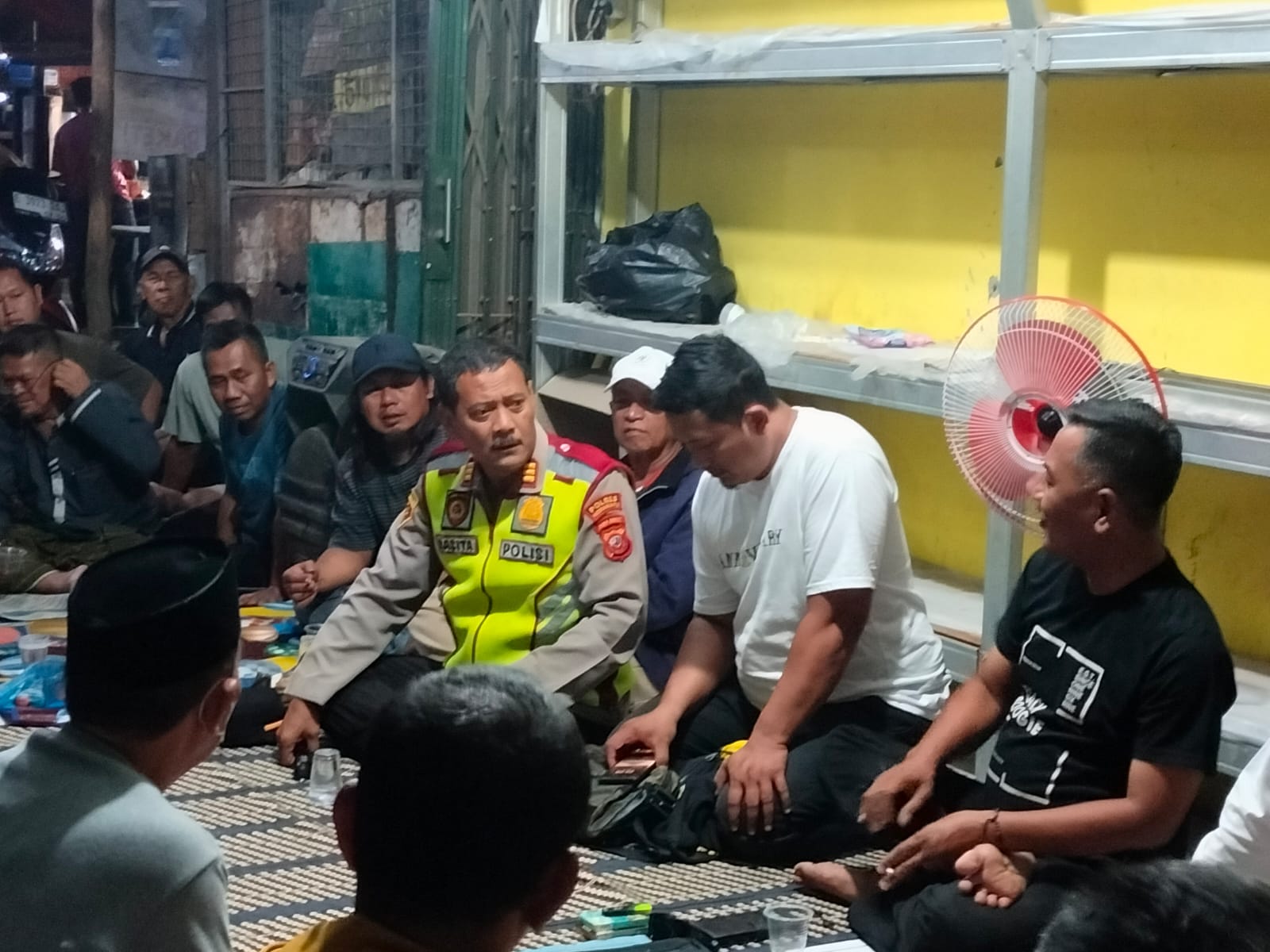 Indramayu – Kapolsek Anjatan, Polres Indramayu Polda Jabar AKP H. Rasita, SH, bersama Kanit Propos Aipda Sriyanto melaksanakan silaturahmi kamtibmas dengan tokoh masyarakat dan pedagang di Pasar Desa Kedungwungu, Kecamatan Anjatan, Kabupaten Indramayu, Sabtu malam (6/9/2025).