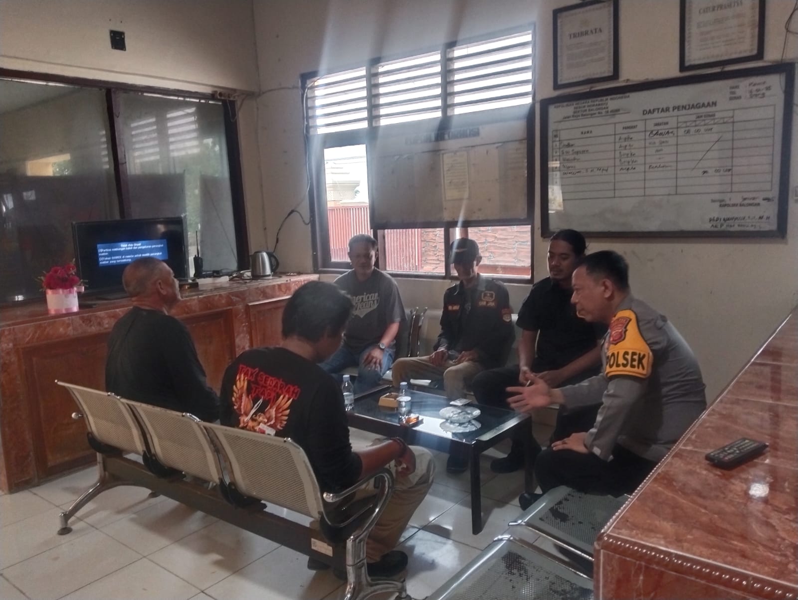 Suasana penuh kehangatan terlihat di ruang pertemuan saat para tokoh duduk berdiskusi santai bersama anggota kepolisian.
