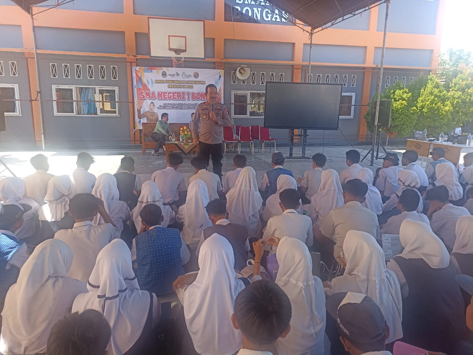 Indramayu – Kapolsek Bongas, Polres Indramayu Polda Jabar, Iptu Maryudi, S.H., bersama Anggota Bhabinkamtibmas, memberikan materi tentang hak atas kebebasan berkumpul dan berorganisasi serta kenakalan remaja atau darurat gank motor pada Masa Pengenalan Lingkungan Sekolah (MPLS) Tahun Ajaran 2024/2025 di SMAN 1 Bongas, Kabupaten Indramayu, Selasa (16/7/2024)