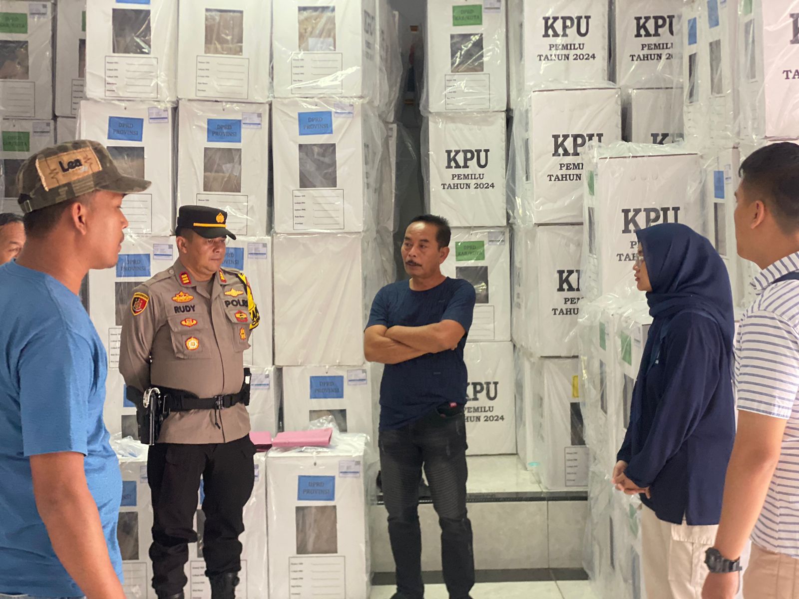 Majalengka – Kapolsek Cikijing Polres Majalengka Polda Jabar AKP Rudy Djunardi M, S.H., M.H. didampingi Ps. Panit Min Ik. Aipda Purwanto bersama Camat Cikijing Dani Lutfi Daniar, S.Sos., Kp. melaksanakan pengecekan logistik kelengkapan Pemilu berupa bilik suara dan kotak suara di gudang penyimpanan logistik Pemilu di PPK Kecamatan Cikijing, Kabupaten Majalengka, Minggu (04/02/2024).
