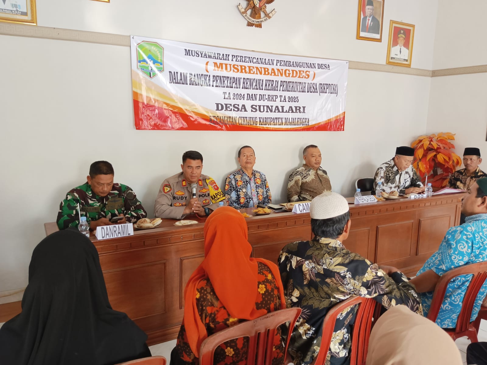 Majalengka – Sesuai arahan dari Kapolres Majalengka Polda Jabar AKBP Indra Novianto,S.I.K.,M.Si., CPHR., melalui Kapolsek Cikijing Polres Majalengka Polda Jabar AKP Rudy Djunardi M, S.H., M.H. beserta anggota menghadiri pelaksanaan Musrenbangdes Tahun Anggaran 2024 dalam rangka pembahasan RKP Desa Tahun 2024 dan rencana daftar usulan (DU) RKP Desa Tahun 2025 di Aula Desa Sunalari, Kecamatan Cikijing, Kabupaten Majalengka, Sabtu (14/10/2023).