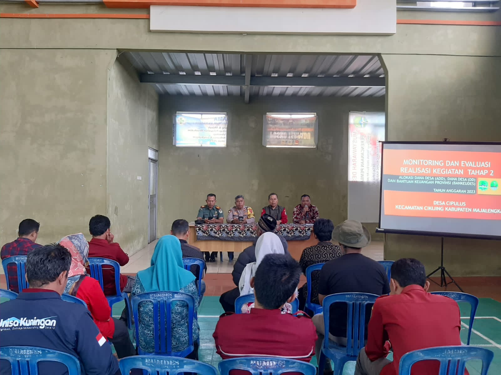 Hadir dalam kegiatan Monitoring dan Evaluasi (Monev) DD/ADD tahap ll Tahun 2023 di antaranya Camat Cikijing Dani Lutfi Daniar, S.Sos.,Kp , Danramil Cikijing Kapten Inf. Dadang Purnomo, Kepala Desa Cipulus, Ketua BPD Cipulus, para Kasi Kecamatan Cikijing, Apdes Desa Cipulus.