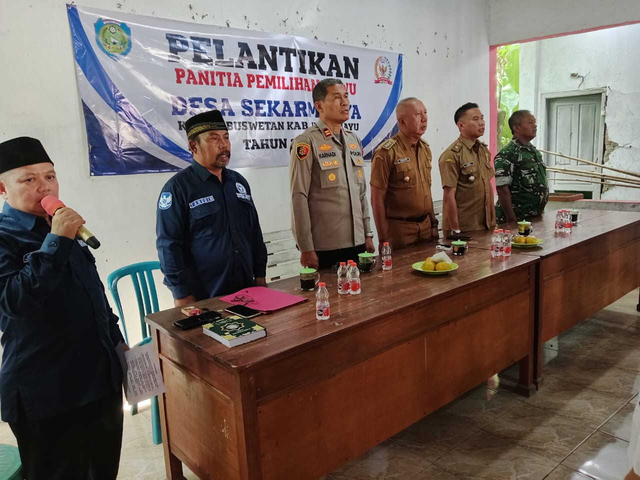 Dalam pelantikan tersebut, IPTU H. Karnadi Kapolsek Gabuswetan Polres Indramayu, ikut hadir dan sekaligus memberikan arahan kepada Panitia Pilwu Desa Sekarmulya.