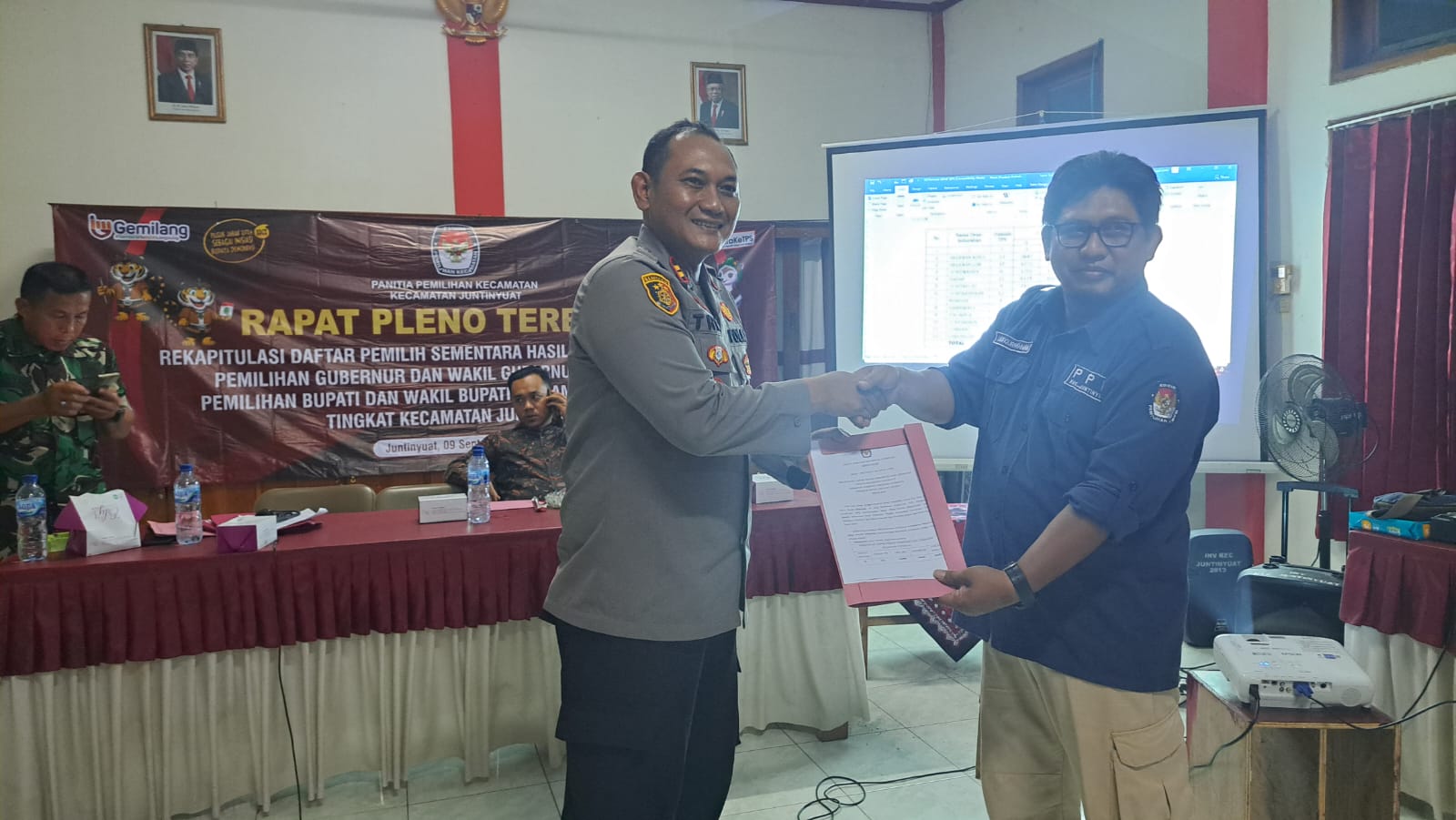 Indramayu – Kapolsek Juntinyuat, Polres Indramayu Polda Jabar IPTU Trio Tirtana H, S.H., menghadiri Rapat Pleno Terbuka Rekapitulasi Daftar Pemilih Sementara Hasil Perbaikan (DPSHP) untuk Pemilihan Gubernur dan Wakil Gubernur Jawa Barat serta Pemilihan Bupati dan Wakil Bupati Indramayu Tahun 2024.