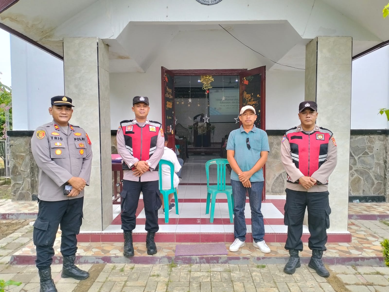 Indramayu – Kapolsek Juntinyuat, IPTU Trio Tirtana, S.H., memimpin pengamanan kebaktian rutin Minggu di Gereja Kristen Pasundan (GKP) Juntikebon, Kecamatan Juntinyuat, Kabupaten Indramayu, Minggu (22/12/2024).