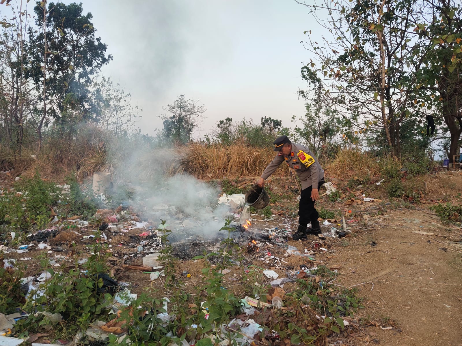 Kapolsek Kdp Polres Majalengka Polda Jabar AKP Nana Suhana pada saat akan melakukan kontrol dan sambang ke tempat pembuangan akhir sampah di Desa Heuleut, melihat adanya sampah yang dibakar di pinggir jalan dan ditinggalkan oleh orang yang membakar nya. Sabtu (2/9/2023).