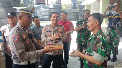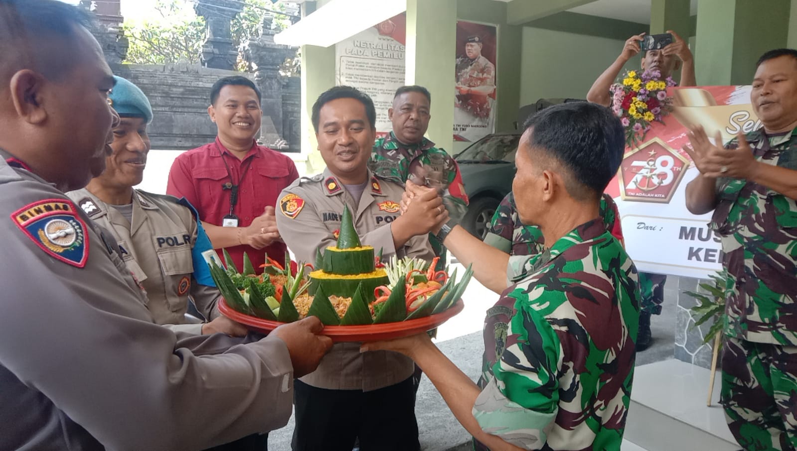Kapolsek Kuta Utara Kompol I Made Pramasetia, S.H.,S.I.K.,M.H bersama Anggota beri kejutan ke Mako Koramil 1611- 03 Kuta dengan memberikan ucapan HUT Tentara Nasional Indonesia ke-78 tahun 2023. Kamis (5/10) pukul 10.00 Wita.