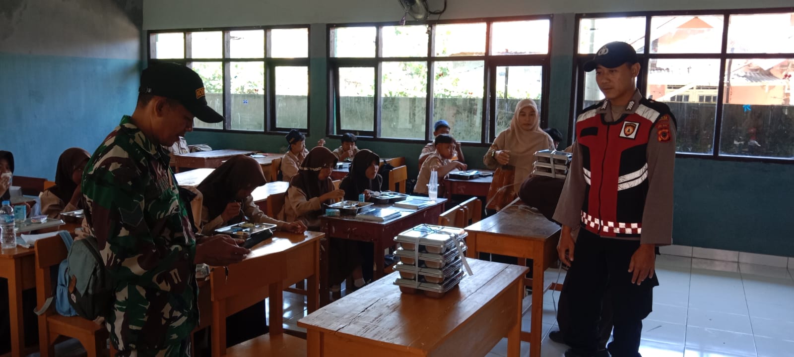 Di ruang kelas, petugas memastikan makanan diterima siswa dengan tertib.