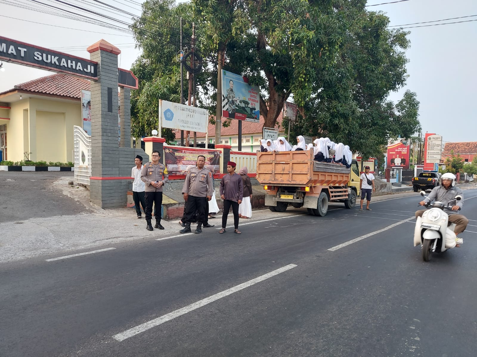 Majalengka, Kapolsek Sukahaji Polres Majalengka AKP Erik Riskandar bersama Kanit Samapta AIPTU Riyana dan Briptu Bayu beserta Tiga Pilar lakukan pengamanan dan pengawalan kegiatan pawai ta aruf dalam rangka hari santri nasional.