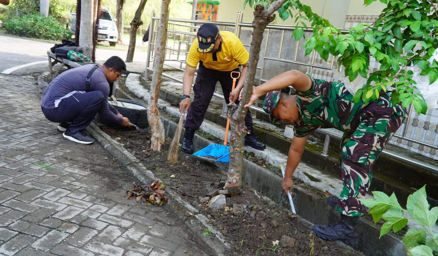 Bersama masyarakat, puluhan prajurit diterjunkan untuk membersihkan Masjid Al Fitri di perumahan Buwi Winongo Indah, Kelurahan Winongo, Kecamatan Manguharjo, Kota Madiun.