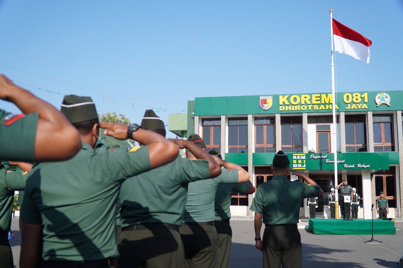 MADIUN, BUSERJATIM.COM GROUP- Kepala Staf Korem (Kasrem) 081/DSJ Lekol Inf Yuli Eko Purwanto memimpin Upacara Bendera 17an di Makorem 081/DSJ, Jl. Pahlawan, No. 50, Kota Madiun, Senin (18/9/2023). Selaku Irup, Kasrem membacakan amanat Pangdam V/Brawijaya Mayjen TNI Farid Makruf.