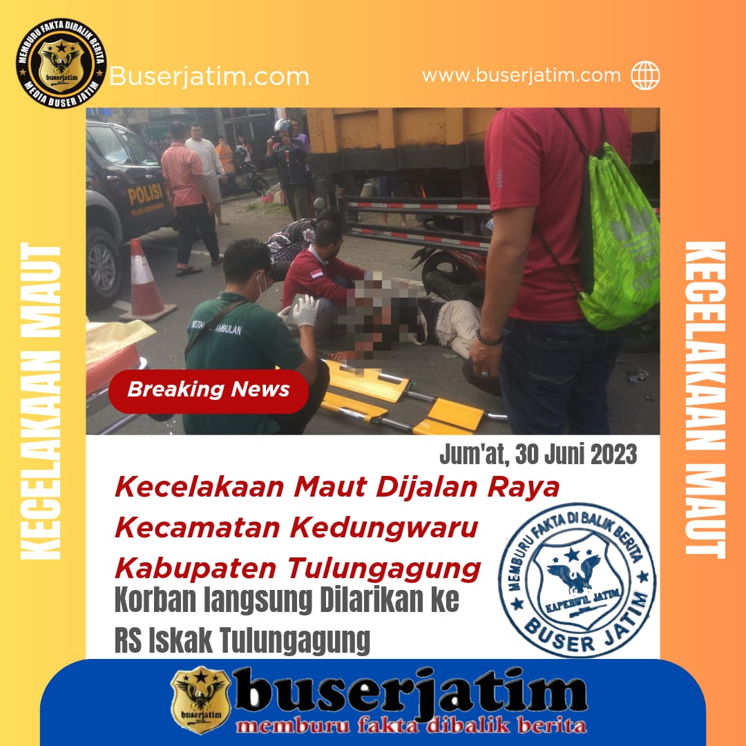 BUSERJATIM.COM || TULUNGAGUNG – Telah terjadi kecelakaan maut di jalan raya jalan Pahlawan kecamatan Kedungwaru kabupaten Tulungagung. Jum’at (30/06/2023) Pukul 10.00 WIB, Tepatnya di jalan raya besar Nasional Utara RSPW ( Rumah Sakit Putra Waspada) truk tronton melaju dari arah utara mau berhenti muat barang, awalnya truck tersebut berjalan pelan karena mau berhenti muat barang ‘ujar sis sopir truck.