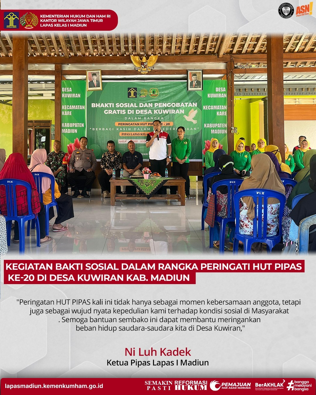 MADIUN, BUSERJATIM. COM GROUP – Dalam rangka memperingati ulang tahun ke-20 Paguyuban Ibu-Ibu Pemasyarakatan (PIPAS) Lapas I Madiun Kanwil Kemenkumham Jatim menyelenggarakan kegiatan bakti sosial di Desa Kuwiran Kec. Kare Kab. Madiun. Acara ini bukan hanya sekadar merayakan usia organisasi, tetapi juga sebagai wujud kepedulian terhadap masyarakat, (25/01).