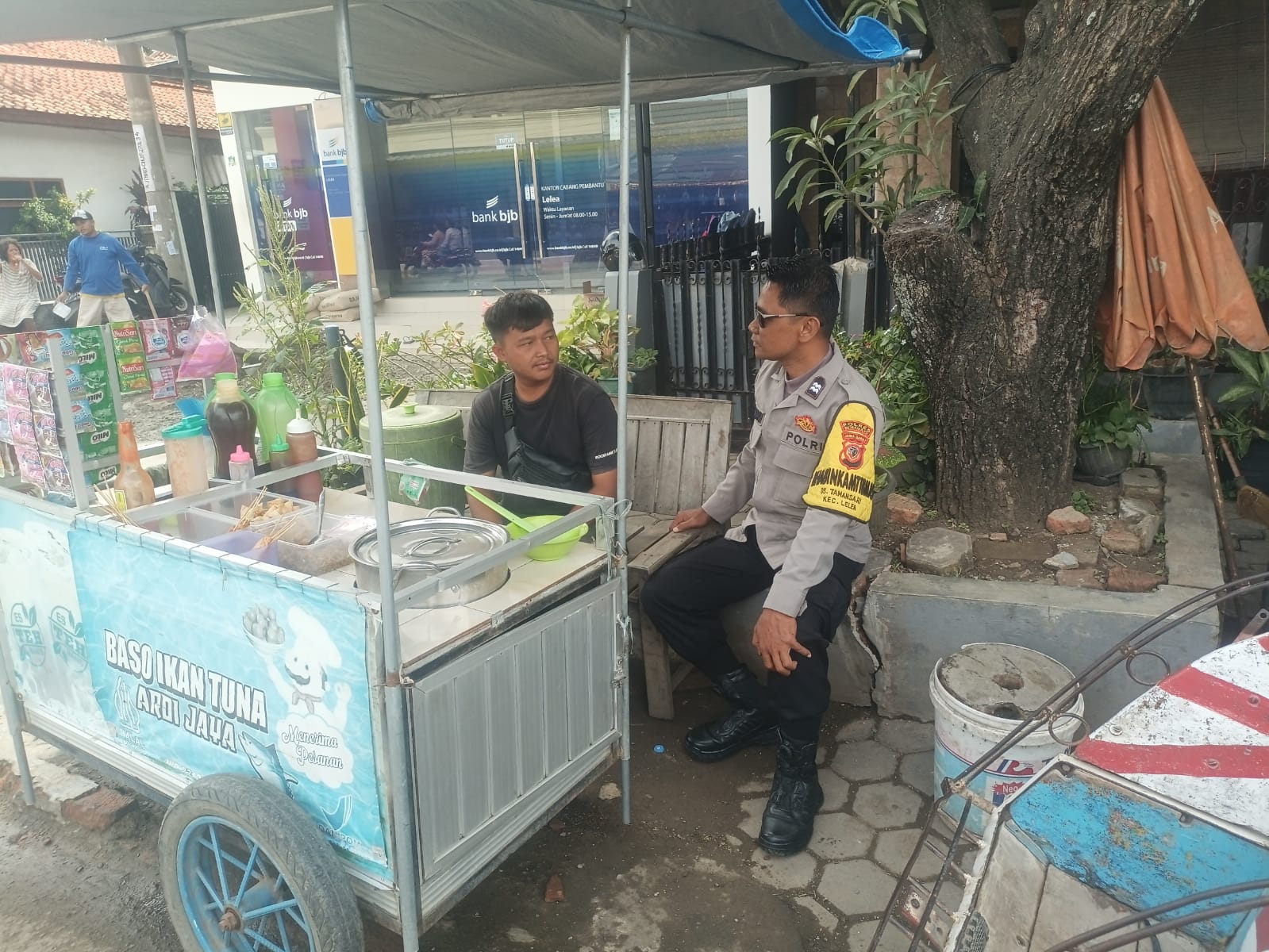 Dalam kunjungannya, Aiptu Haerudin menyempatkan diri berbincang dengan seorang pedagang bakso ikan keliling.