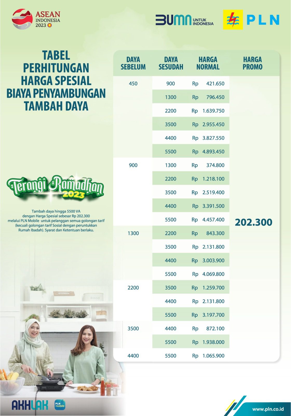 Selain Itu bertepatan dengan bulan suci Ramadhan, PT PLN (Persero) kembali memberikan promo tambah daya untuk rumah ibadah melalui program Ramadhan Berkah 2023. Hanya dengan Rp 150 ribu rumah ibadah bisa menaikkan daya hingga 5.500 Volt Ampere (VA).