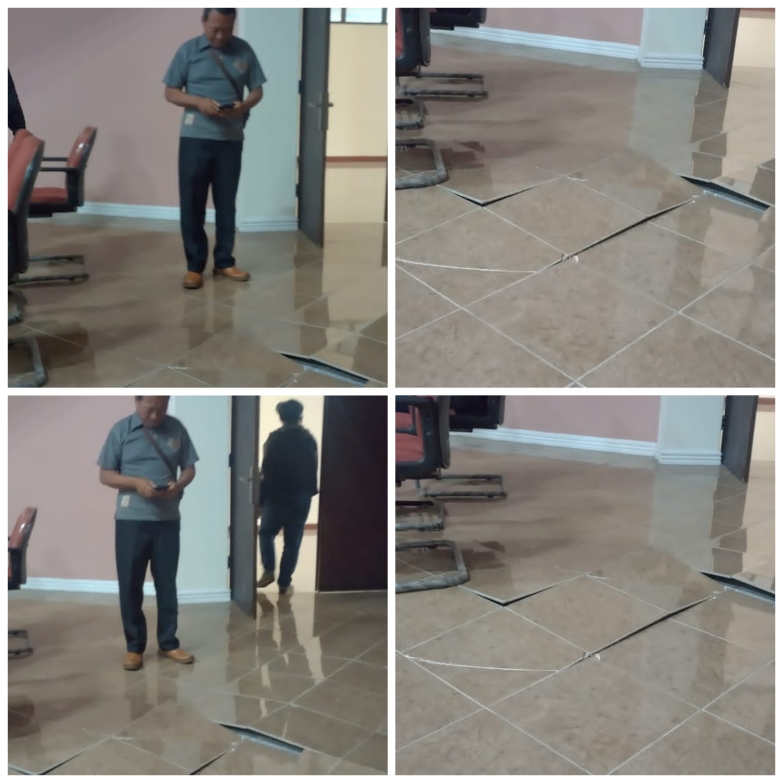 “Awas hati-hati tersandung, tidak sengaja barusan sempat terinjak, karena sebelumnya saya tidak tau kalau lantai keramiknya retak” ujar dia sembari memberitahukan kepada rekan-rekan jurnalis yang lain, agar tidak menginjak.