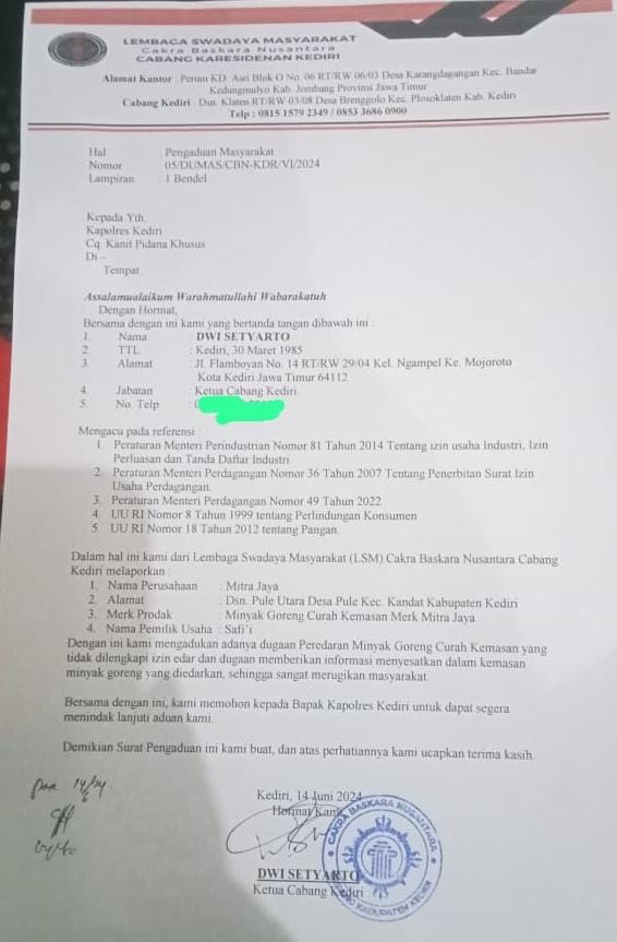KEDIRI,BUSERJATIM.COM- Jumat (14/6/24), Ketua Cabang Lembaga Swadaya Masyarakat (LSM) Cakra Baskara Nusantara (CBN) Kediri melaporkan Safi’i Pemilik Home industri atas dugaan peredaran dan penjualan minyak goreng curah tanpa izin BPOM ke Polres Kediri.