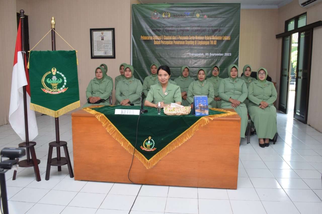 Trenggalek, Buserjatim.com – Ketua Persit KCK Cabang XX Dim 0806 Trenggalek, Ny. Jeane Peddy beserta anggota pengurusnya turut menghadiri sebuah acara penting yang bertujuan untuk mempercepat penurunan stunting di lingkungan TNI AD. Acara ini berlangsung dalam bentuk ceramah virtual dengan tema “Meluncurkan Aplikasi E-Stuntad dan E-Posyandu serta Webinar Hybrid Motivator dalam Percepatan Penurunan Stunting” di Aula Rapat Makodim 0806/Trenggalek, Selasa (5/9/2023).