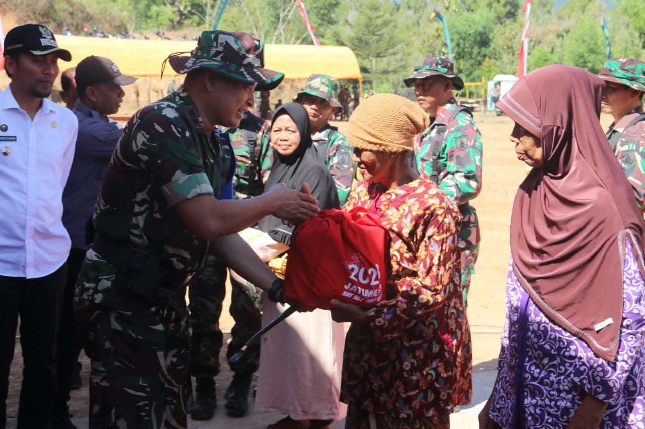 Kodim 0803/Madiun Salurkan Paket Sembako Bagi Warga Kurang Mampu Pada Pembukaan TMMD ke 117.