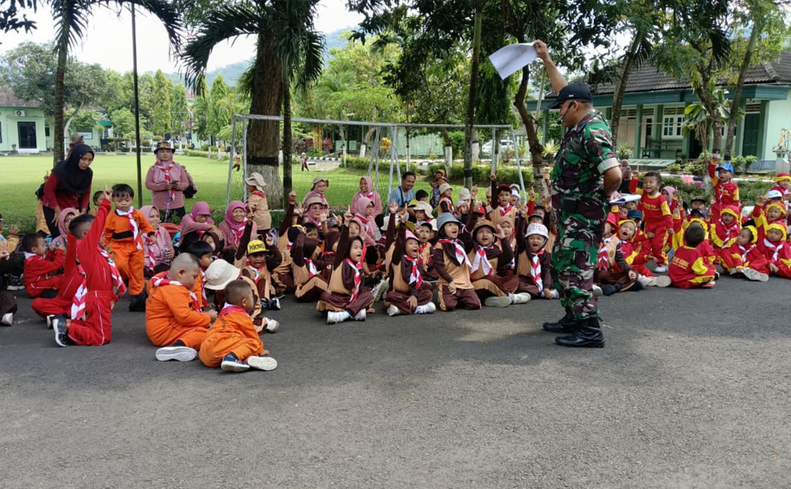 Keakraban anak-anak dan prajurit terasa begitu cair sejak awal pertemuan. Dua prajurit pilihan, Pelda Komarul Huda dan Pelda Suwoto, yang selama ini dikenal piawai mendampingi pendidikan nonformal, tampil dengan gaya komunikatif dan penuh kehangatan. Mereka mengawali kegiatan dengan pengenalan dunia Pramuka Pra Siaga melalui nyanyian, gerak dasar, serta permainan kekompakan. Suasana sontak berubah ceria, halaman Makodim pun menyerupai taman bermain edukatif yang hidup.