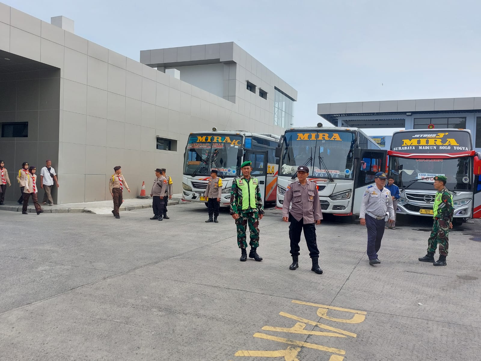 Madiun, Jawa Timur – Personel Kodim 0803/Madiun bersama petugas gabungan dari Polres Madiun, Dinas Perhubungan (Dishub), Satuan Polisi Pamong Praja (Satpol PP), dan Dinas Kesehatan (Dinkes) bahu membahu mengamankan arus mudik di Terminal Purboyo, Madiun.