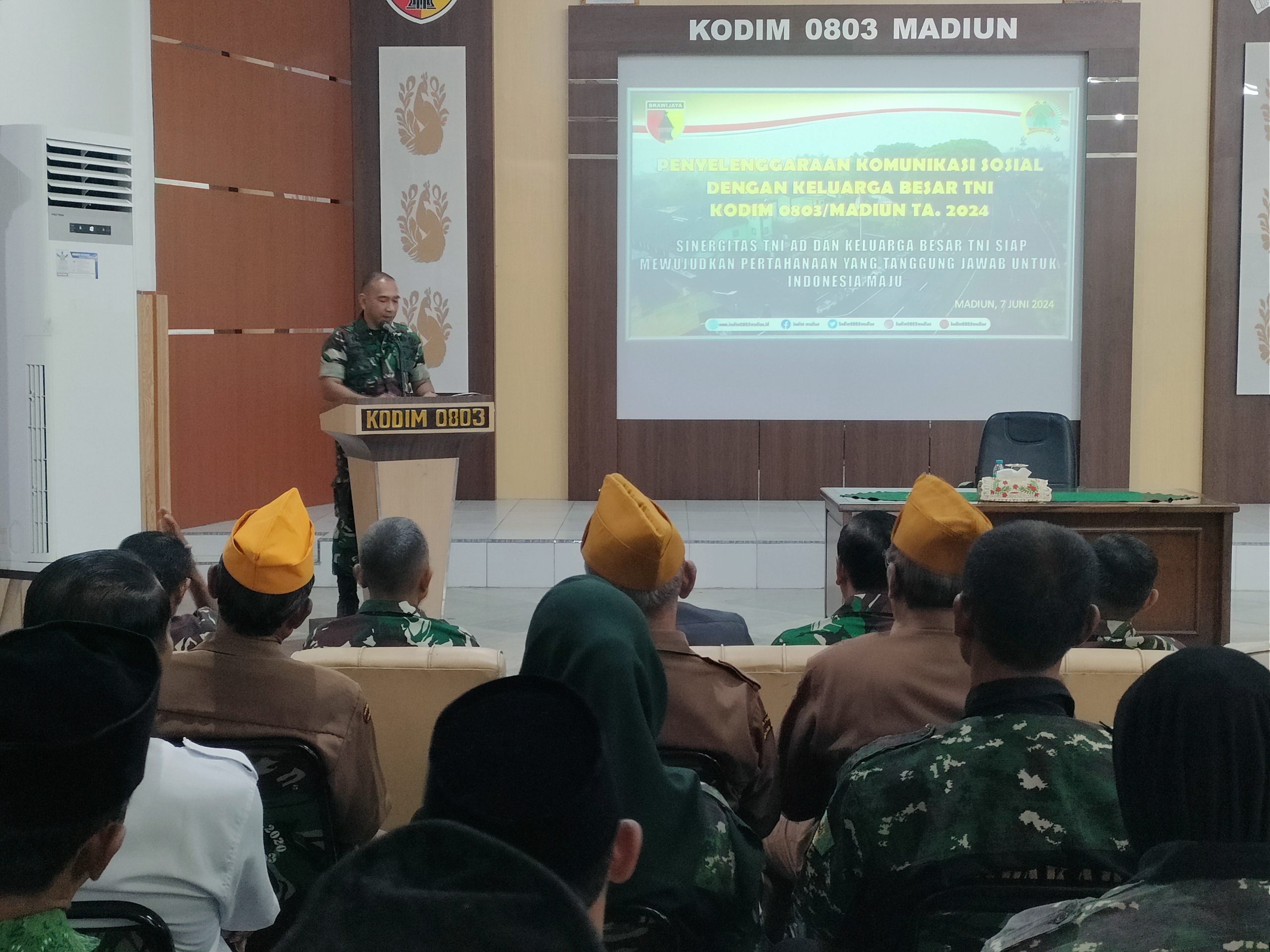 Madiun, 1 Juli 2024 – Kodim 0803/Madiun secara resmi menyelenggarakan kegiatan Komunikasi Sosial dengan tema “Sinergitas TNI AD dan Keluarga Besar TNI Siap Mewujudkan Pertahanan yang Tangguh untuk Indonesia Maju”. Kegiatan ini dibuka secara resmi oleh Kasdim Mayor Inf Tommy Fedy Anugerahan, dan bertempat di Aula Makodim Jl. Pahlawan no 25 Kota Madiun.