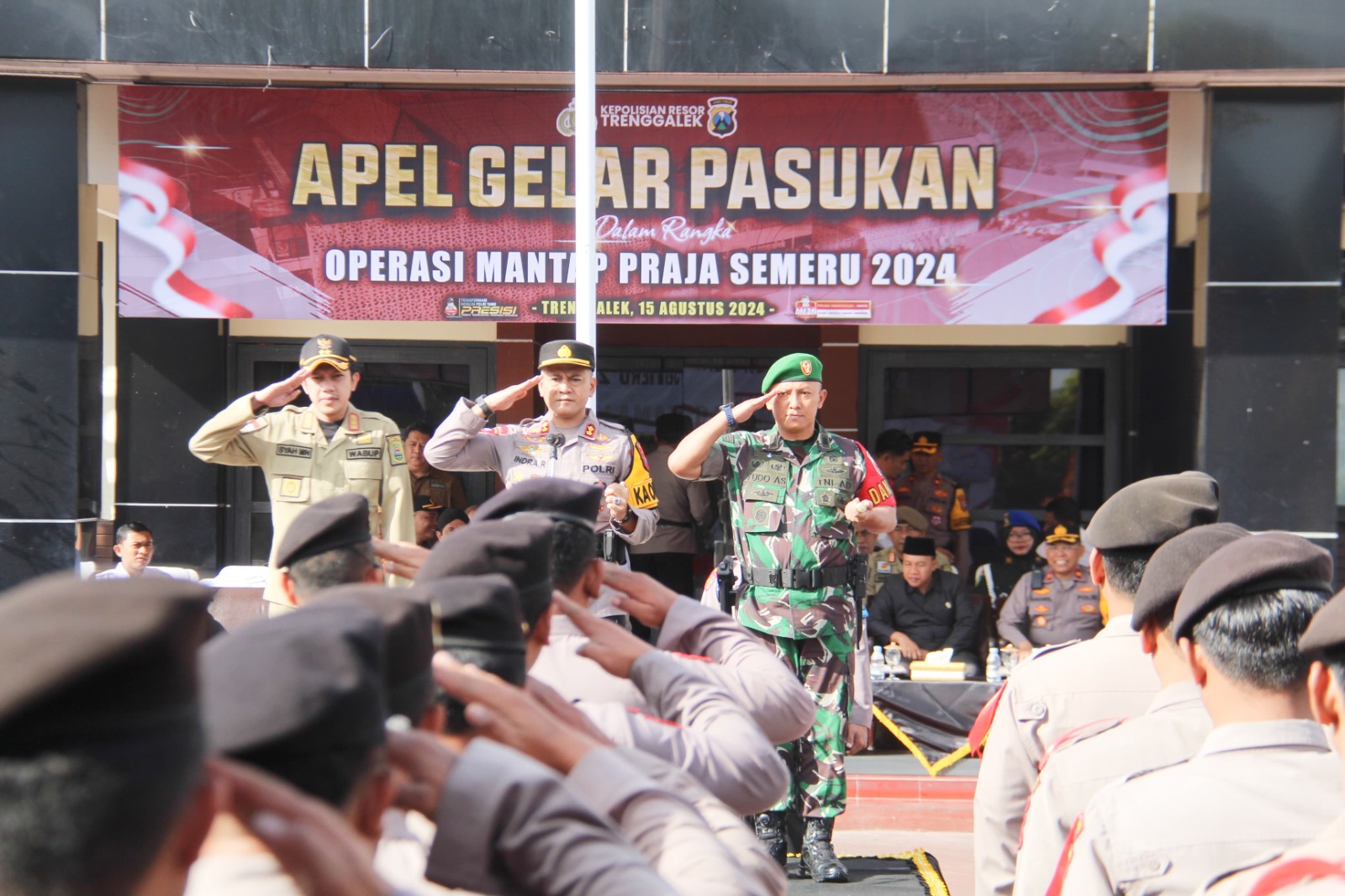 Trenggalek, Buserjatim.com – Dalam rangka memastikan kesuksesan Pemilihan Umum Kepala Daerah (Pemilukada) 2024 Kabupaten Trenggalek, Dandim 0806/Trenggalek Letkol Czi Yudo Aji Suansto, S.Sos., M.A., bersama Wakil Bupati Trenggalek Syah Muhamad Nata Negara, secara antusias mendampingi Kapolres Trenggalek AKBP Indra Ranu Dikarta, S.I.K., M.Si., dalam memimpin Apel Gelar Pasukan Sistem Pengamanan Kota (Sispamkota) Operasi Mantap Praja Semeru 2024 yang dilaksanakan di Mapolres Trenggalek, Kamis (15/8/2024).