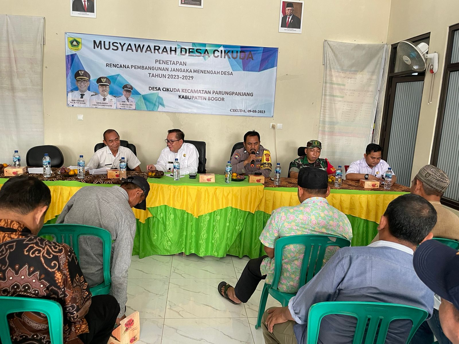 Bhabinkamtibmas Desa Cikuda Polsek Parungpanjang Polres Bogor Aiptu SOMA dan Babinsa Serda Kristiono Sasongko Sambangi warga dalam acara Rapat Musdes Rencana Pembangunan Jangka Menengah (RPJM) Tahun 2024.