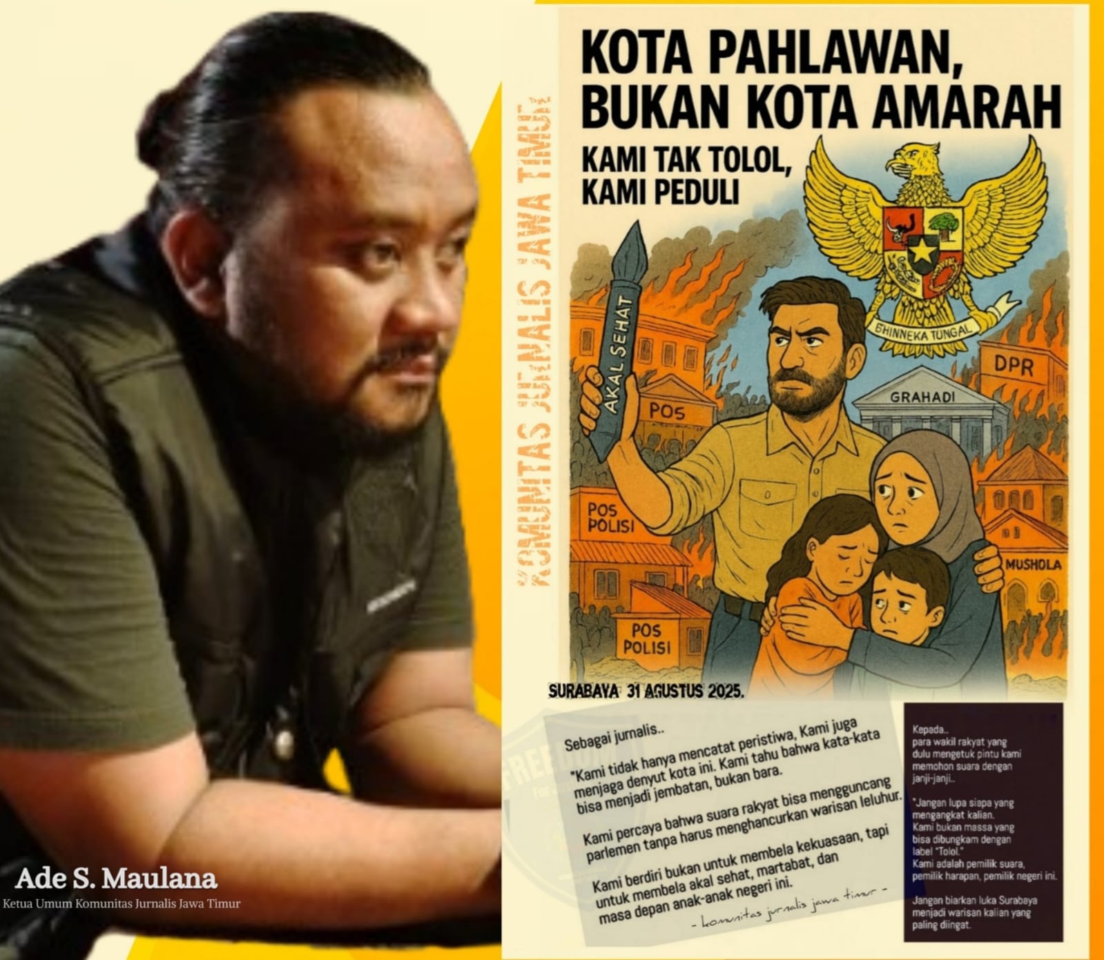 Sebagai jurnalis, kami tidak hanya mencatat peristiwa. Sebagai sembangsih kami kepada negeri, kami ikut menjaga denyut kota ini. Kami tahu bahwa kata-kata bisa menjadi jembatan, bukan bara. Kami percaya bahwa suara rakyat bisa mengguncang parlemen tanpa harus menghancurkan warisan leluhur. Kami berdiri bukan untuk membela kekuasaan, tapi untuk membela akal sehat, martabat, dan masa depan anak-anak negeri.