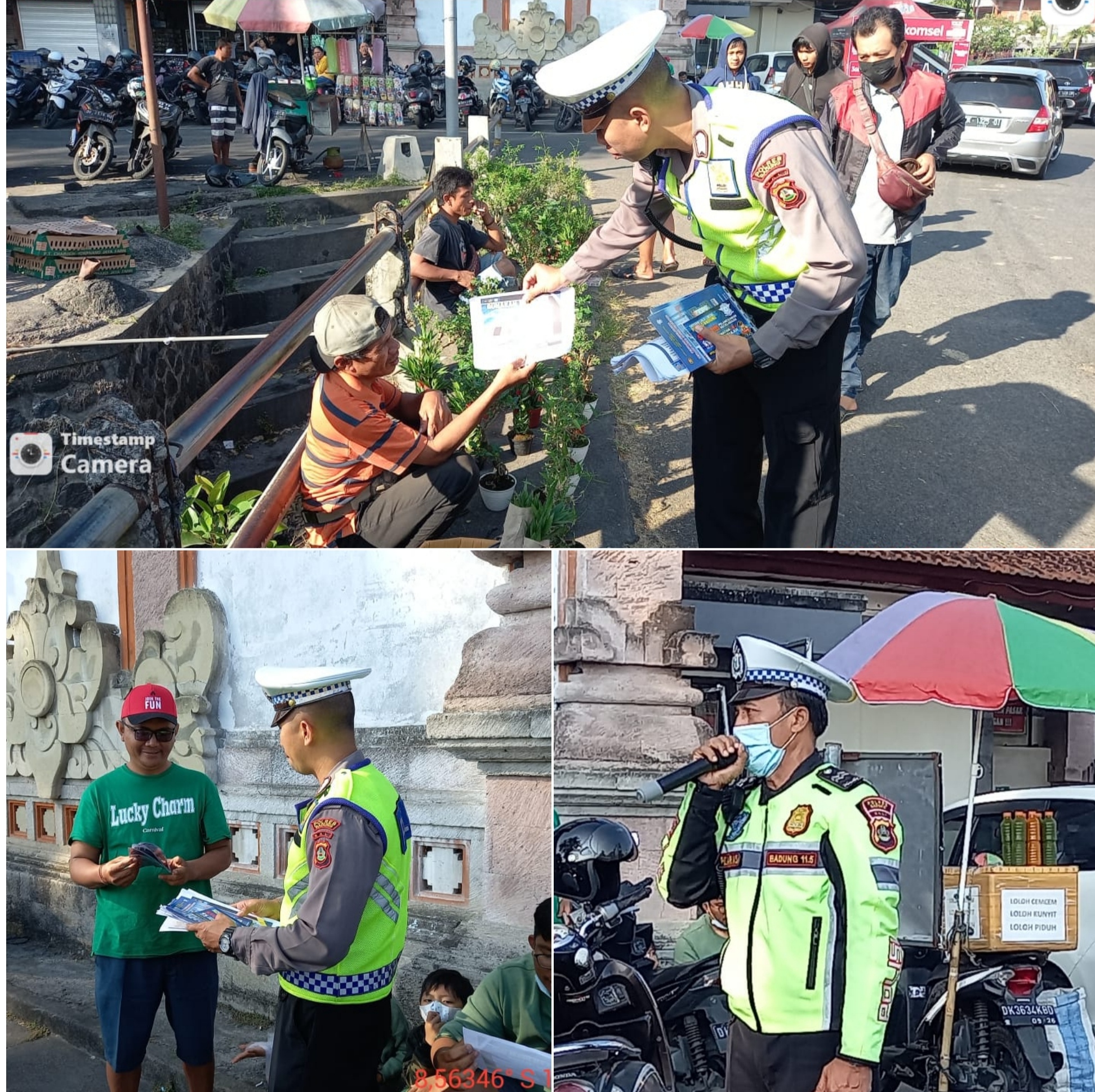 Sebagai bentuk upaya meminimalisir terjadinya pelanggaran lalu lintas, Satuan Lalu Lintas melalui Unit Kamsel melaksanakan kegiatan sosialisasi dan edukasi ke masyarakat diberbagai tempat keramaian seperti di lokasi pasar hewan Beringkit Jln Raya I Gst Ngr Rai Desa Mengwitani Kecamatan Mengwi Kabupaten Badung, Bali. Rabu 28Juni 2023 pagi