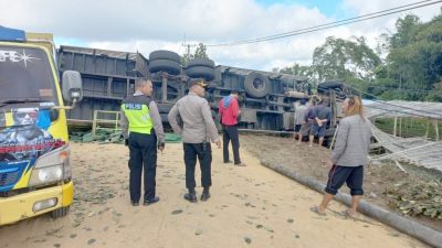 Personil Polsek Kintamani bersama masyarakat melaksanakan evakuasi truk yang mengalami laka lantas di Jalan Raya Sekaan – Tegalalang. Sabtu, (29/07).