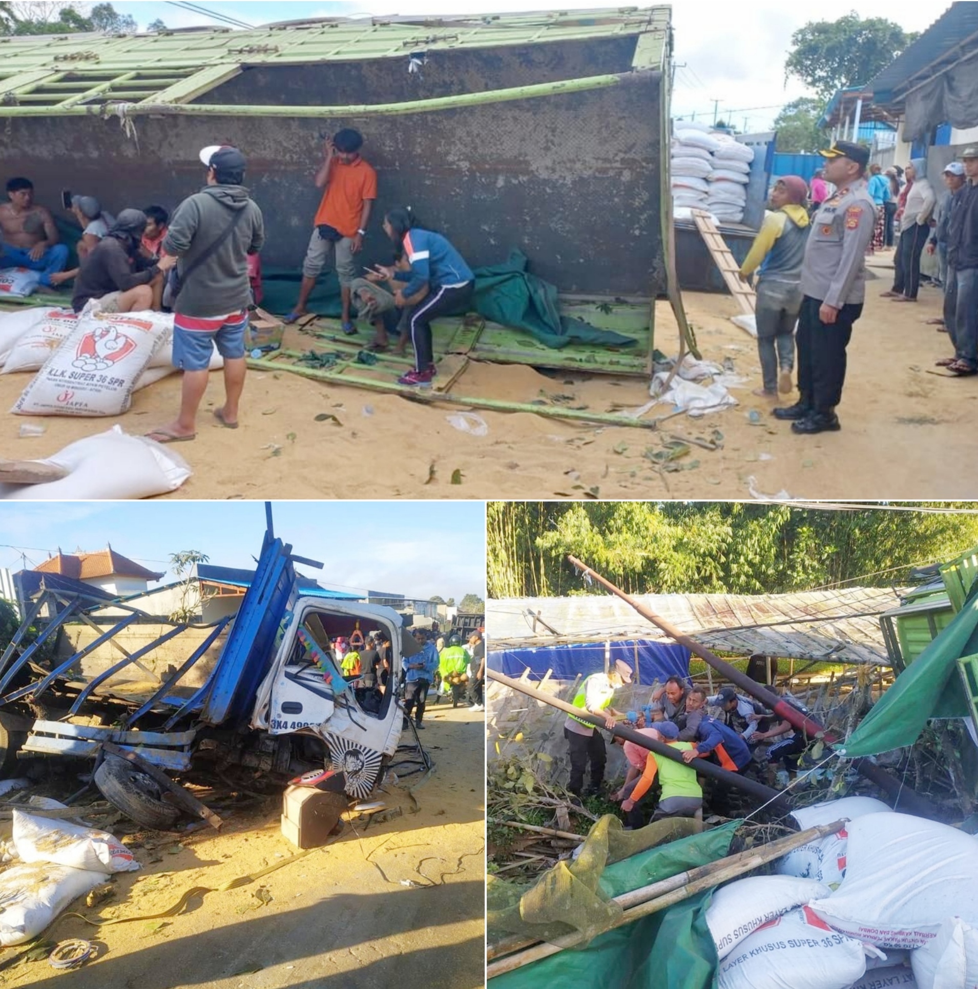 Kejadian yang melibatkan Truk Isuzu Warna Putih yang memuat pakan ternak ayam dengan Truk Tronton warna hijau terjadi pada Sabtu pagi sekitar pukul 07.20 wita disebabkan karena Truk Tronton mengalami Rem Blong sehingga Pengemudi tidak bisa mengendalikan kendaraannya dan menabrak Truk Isuzu Warna Putih yang ada di depannya, yang menyebabkan Truk Isuzu terguling dan menabrak pohon dan Truk Tronton warna hijau tetap melaju oleng kekanan dan masuk ke kebun warga kemudian menabrak tiang dan terguling melintang di tengah jalan.