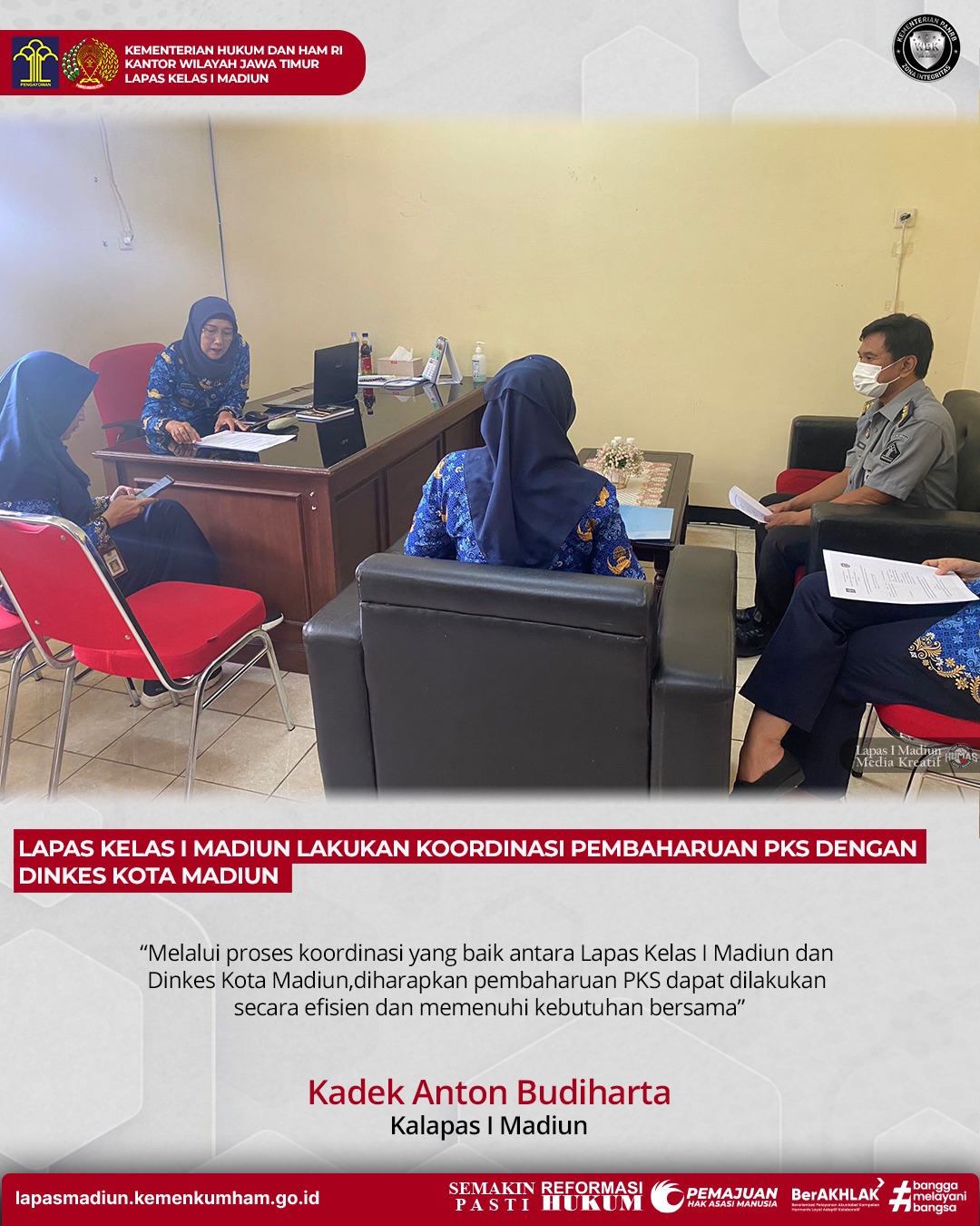 Kalapas I Madiun, Kadek Anton Budiharta menyampaikan, “Melalui proses koordinasi yang baik antara Lapas Kelas I Madiun dan Dinkes Kota Madiun, diharapkan pembaharuan PKS dapat dilakukan secara efisien dan memenuhi kebutuhan bersama,” Ujarnya.