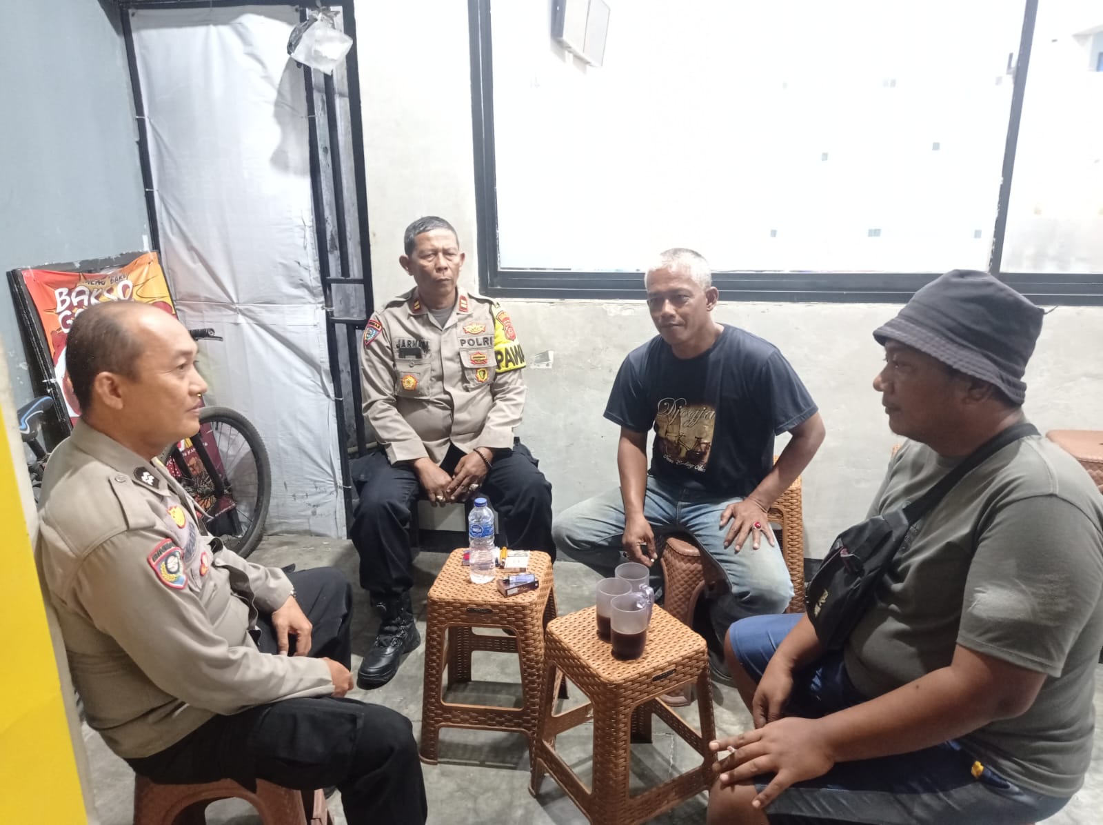 POLRES CIREBON KOTA,- Bhabinkamtibmas kelurahan Sukapura Polsek utbar Polres Cirebon kota Polda Jabar Aiptu waryo mendampingi Kanit binmas Polsek utbar Polres Cirebon kota jalin komunikasi sinergi Kamtibmas, kepada warga di warung kopi RW 07 pancuran kelurahan Sukapura kecamatan kejaksan Cirebon Kota, Minggu (15/09/2024).