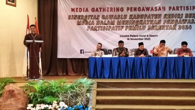 BUSERJATIM.COM || KEDIRI – Media Gathering Pengawasan Partisipatif dengan tema Sinergitas Bawaslu Kabupaten Kediri Bersama Media Mengawal Pemilu Serentak 2024 yang diselenggarakan oleh Badan Pengawas Pemilihan Umum (Bawaslu) Kabupaten Kediri menjadi ajang penting bagi berbagai media massa cetak – online dan Televisi berlangsung di Insumo Palace Hotel Gedung Cendrawasih pada Kamis, 16 November 2023.