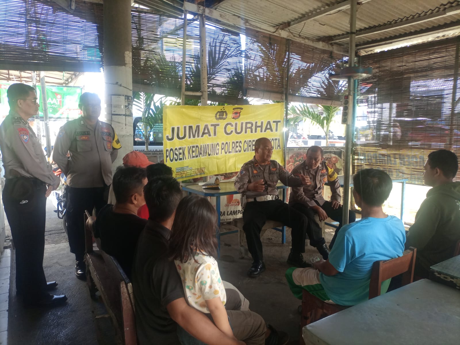 POLRES CIREBON KOTA – KEDAWUNG, Kegiatan “JUMAT CURHAT” yang rutin di lakukan oleh Polsek Kedawung Polres Ciko sebagai bentuk kepedulian Polri dalam menerima dan menampung aspirasi, saran, kritik dan masukan dari warga masyarakat, sekaligus momen sampaikan pesan kamtibmas, dan kali ini kegiatan “Jumat Curhat” Polsek Kedawung di gelar bertempat di Warung Makan Jl.Ir.H.Juanda Desa.Kedawung Kec.Kedawung termasuk Wilkum Polsek Kedawung Polres Cirebon Kota. Jumat (14.07.2023)