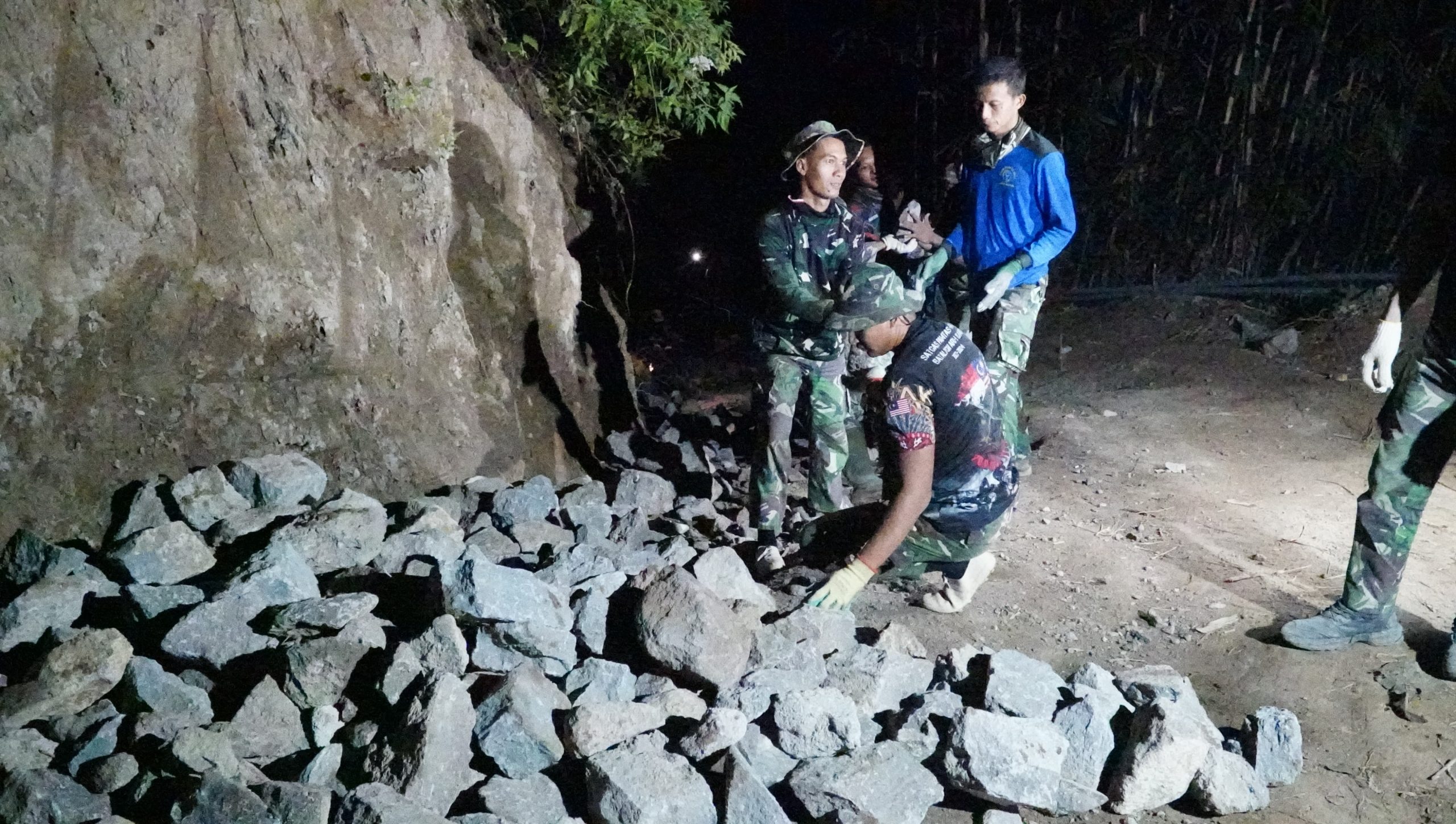 Jalan makadam yang menjadi salah satu sasaran fisik utama TMMD ini harus segera rampung tepat waktu. Setiap ayunan cangkul dan hantaman palu terdengar berpadu dengan suara alam malam, seolah mengiringi tekad para prajurit yang bekerja tanpa kenal lelah.