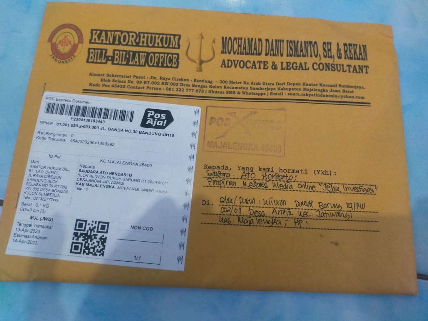 Menurut pimpinan redaksi (pimred) jejakinvestigasi.id, Ato Hendarto, dirinya menerima surat somasi pada hari Jum’at 14 April 2023. Surat tersebut datang dari seseorang bernama DK dan UZ melalui kantor hukum bill-bil-law office Mochamad Danu Ismanto, SH, & Rekan