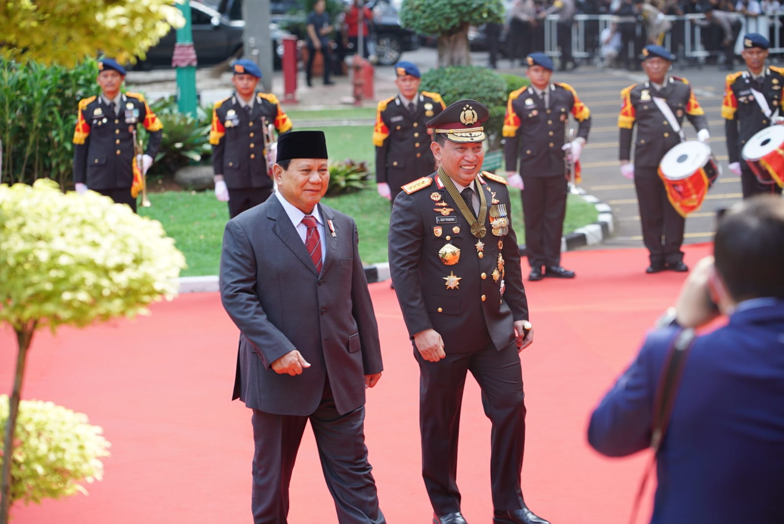 Mengenakan jas dan kopiah, Prabowo tiba di Mabes Polri sekitar pukul 14.00 WIB disambut Kapolri Jenderal Pol. Listyo Sigit Prabowo, Wakapolri Komjen Pol. Agus Andrianto dan para Pejabat Utama Mabes Polri lainnya.