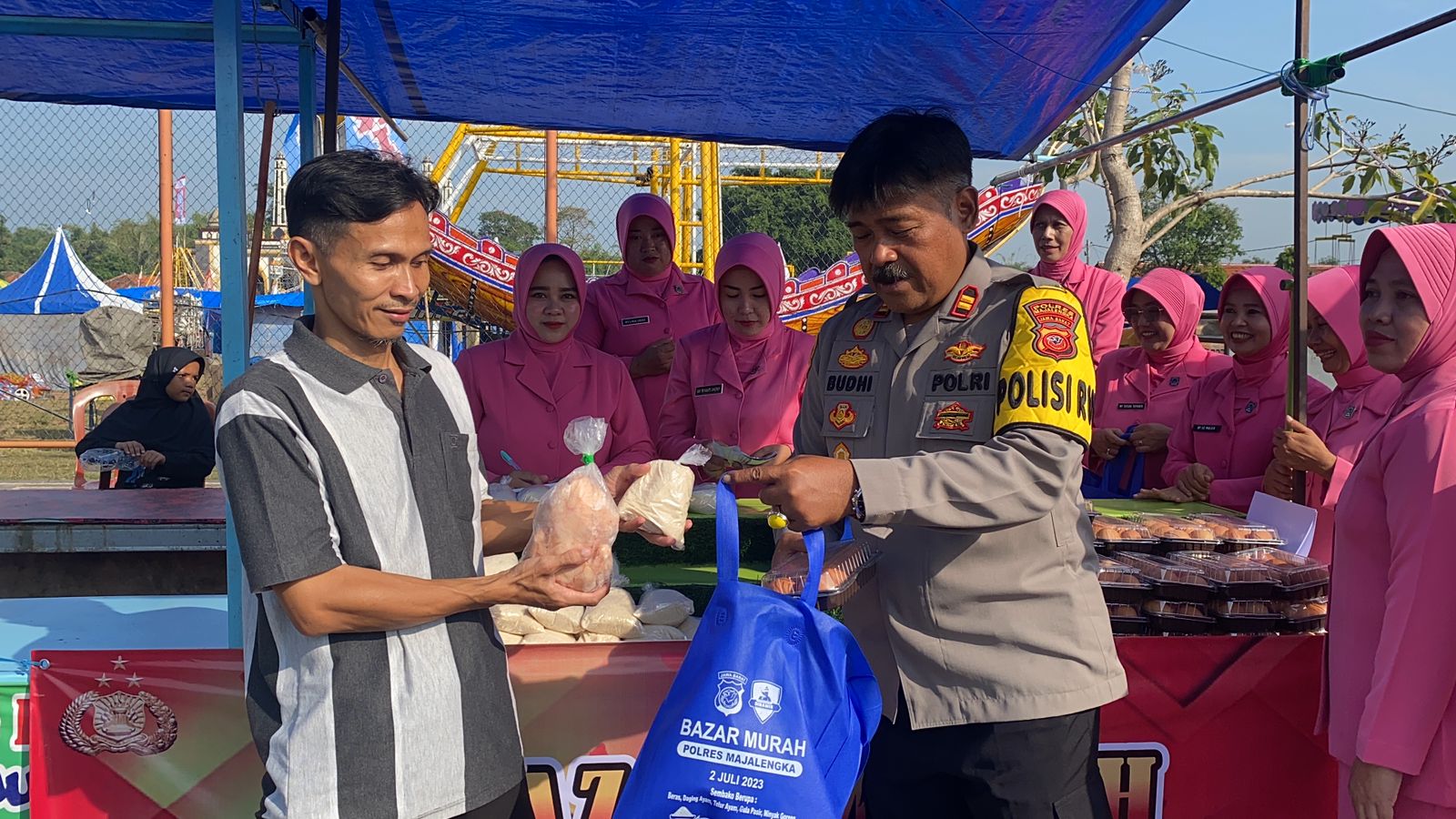 Majalengka, Memeriahkan HUT Bhayangkara ke-77, Jajaran Polsek Polres Majalengka gelar bazar murah paket sembako senilai Kupon Rp 35ribu untuk pembelian Ayam Frozen, telur, Beras, Gula, Minyak Goreng dan Terigu, Minggu (2/7/2023).