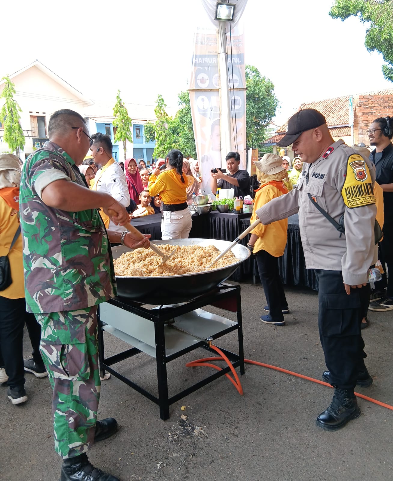 Bhabinkamtibmas AIPDA Dede, bersama Babinsa dan perangkat Desa Jatisura, memasak dan menikmati makan bersama warga setempat dalam rangka memeriahkan HUT JAF, 26 Minggu Oktober 2025