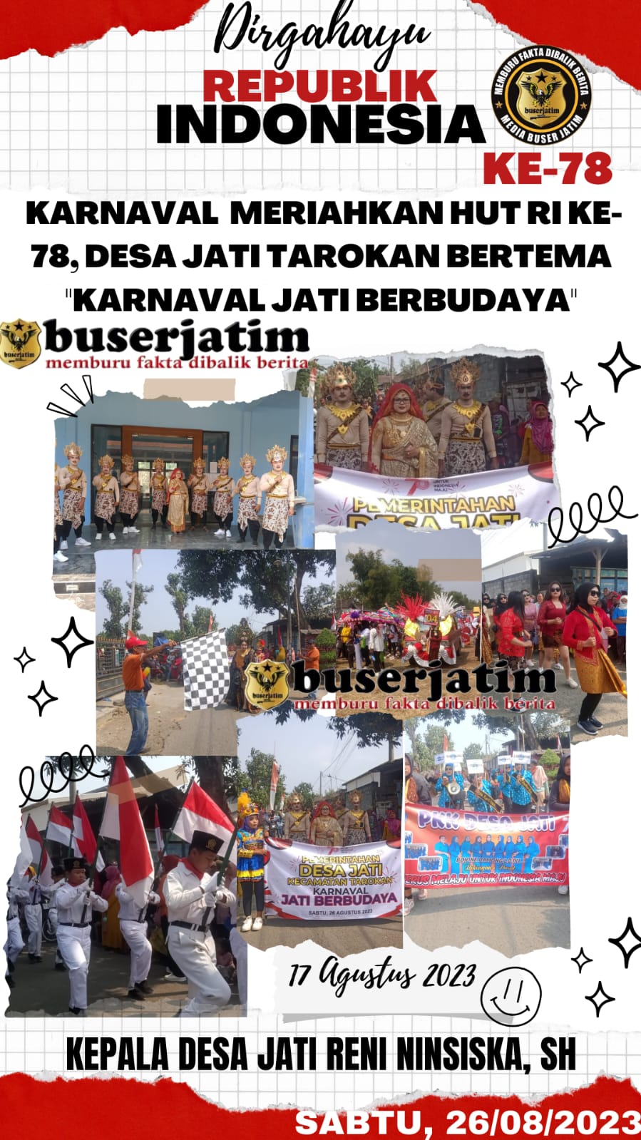 BUSERJATIM.COM || KEDIRI – Dalam Rangka memperingati HUT RI Ke-78, ratusan warga di desa Jati Tarokan tumpah ruah ke jalan-jalan Desa setempat. Karnaval ini terbilang cukup menarik, karena peserta menampilkan beraneka ragam warna baju adat dan hiasan mobil karnaval. Sabtu, 26/08/2023.
