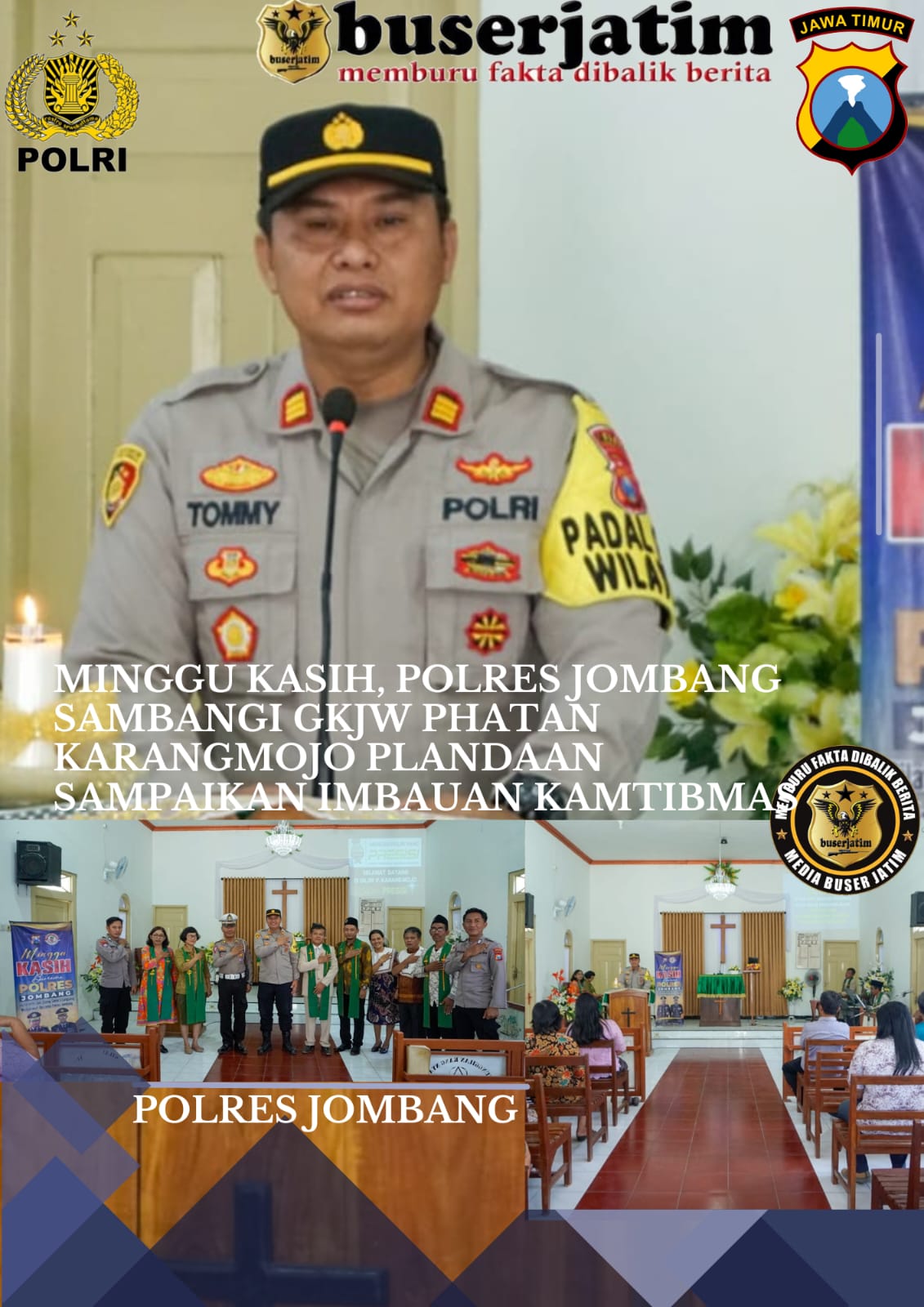 BUSERJATIM.COM || JOMBANG – Guna menjaga keamanan dan ketertiban masyarakat, Polres Jombang mengadakan program kegiatan Minggu Kasih dengan menyambangi Gereja Kristen Jawi Wetan (GKJW) Phatan di desa Karangmojo Kecamatan Plandaan Kabupaten Jombang untuk memberikan imbauan Kamtibmas, Minggu (10/9/2023).