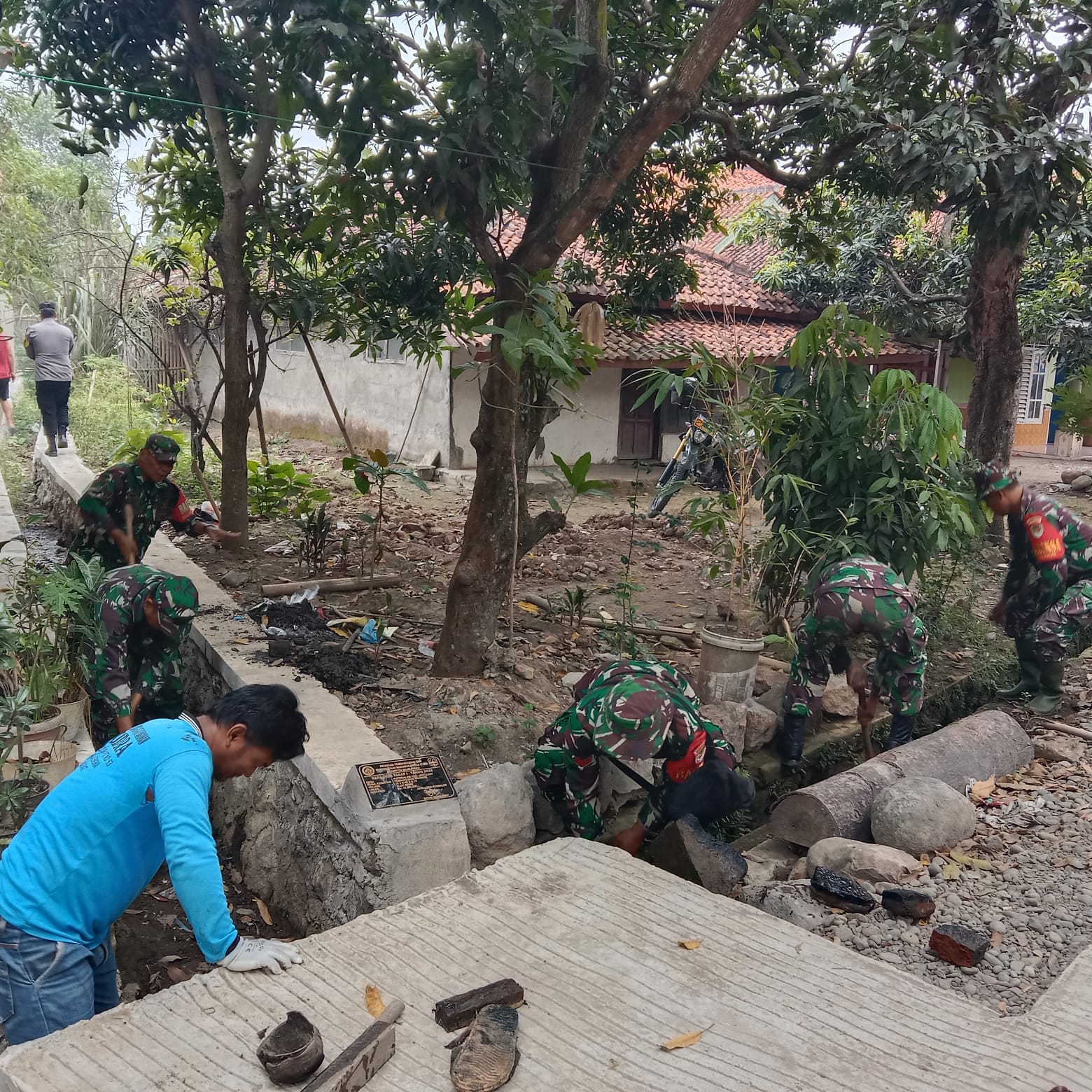 Mitigasi Wabah Penyakit, Anggota Koramil Jatitujuh Laksanakan Karya Bakti Bersihkan Solokan Air