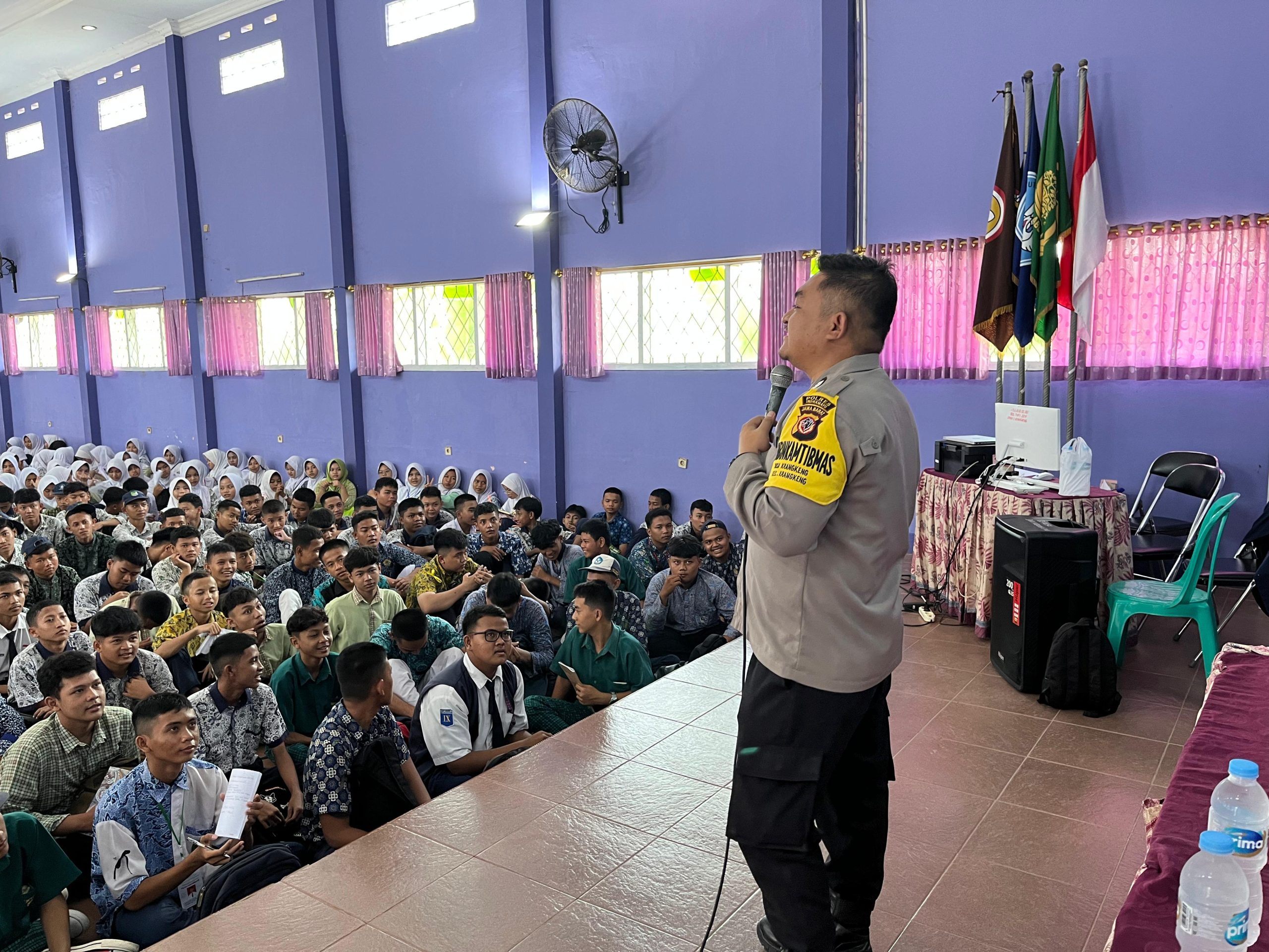 Suasana aula SMA Negeri 1 Krangkeng, Kabupaten Indramayu, tampak dipenuhi ratusan pelajar baru yang serius menyimak materi pembinaan dari kepolisian. Kamis (17/7/2025)